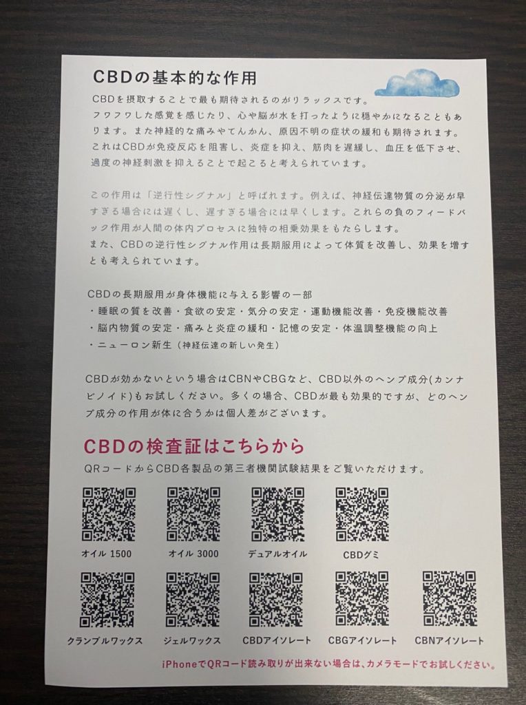 定期的に厚生労働省へ届け出を行ない、THCを含んでいないことが証明された商品です。